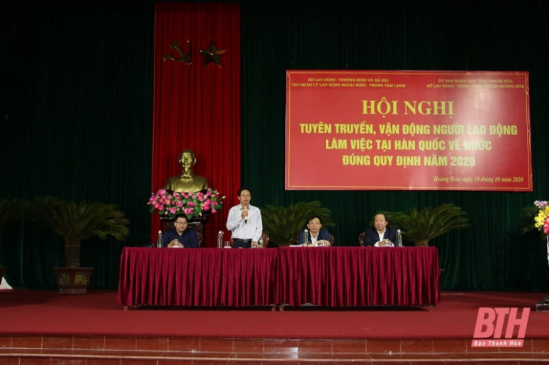 Ngày 19/10, Cục Quản lý lao động ngoài nước, Trung tâm Lao động ngoài nước (Bộ LĐ-TB&XH) phối hợp với Sở LĐ-TB&XH Thanh Hóa và UBND huyện Hoằng Hóa đã tổ chức hội nghị tuyên truyền vận động người lao động làm việc tại Hàn Quốc về nước đúng quy định.