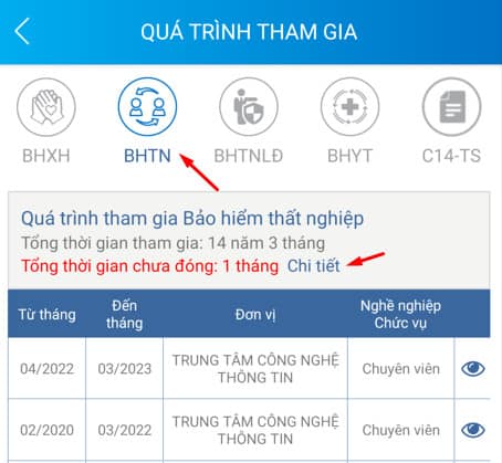 - Xem chi tiết thời gian chưa đóng BHTN