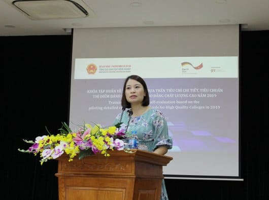 Khóa tập huấn về đánh giá trong là một trong chuỗi các hoạt động hợp tác giữa Tổng cục Giáo dục Nghề nghiệp và Chương trình Đổi mới Đào tạo nghề Việt Nam – GIZ về thí điểm đánh giá tám trường cao đẳng dựa trên tiêu chí, tiêu chuẩn điều chỉnh giành cho trường cao đẳng chất lượng cao năm 2019. “Tôi hy vọng rằng việc đáp ứng các yêu cầu của tiêu chí, tiêu chuẩn sẽ đóng góp vào việc nâng cao chất lượng của trường cao đẳng cũng như của toàn bộ hệ thống giáo dục nghề nghiệp”, Bà Britta van Erckelens, Phó Giám đốc Chương trình Đổi mới Đào tạo nghề Việt Nam phát biểu.