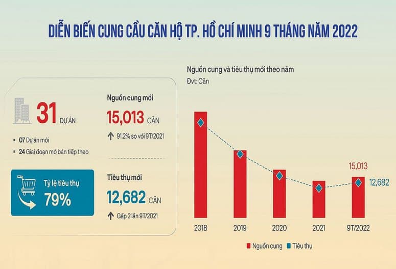 Thông kê sơ bộ của Quý III, TP.HCM ghi nhận 6.726 căn hộ chào bán thành công, tỷ lệ bán giảm 36% so với quý II, nhưng số lượng căn bán ra lại tiếp tục vượt gấp 2,4 lần số lượng căn mở bán. Tổng số căn hộ bán được trong 9 tháng năm 2022 là 18.520 căn hộ, tăng gần gấp đôi số căn chào bán của 9 tháng năm 2021, tăng 73% so với 9 tháng đầu năm 2020 và đạt gần 77% lượng căn hộ bán được của năm 2019.