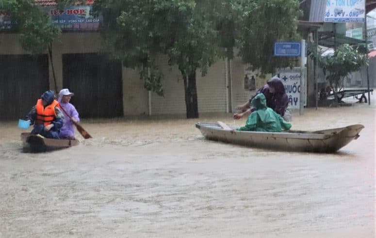 Người dân di chuyển trên đường bị ngập lụt tại TT.Kiến Giang, H.Lệ Thủy, Quảng Bình. Ảnh: TNO
