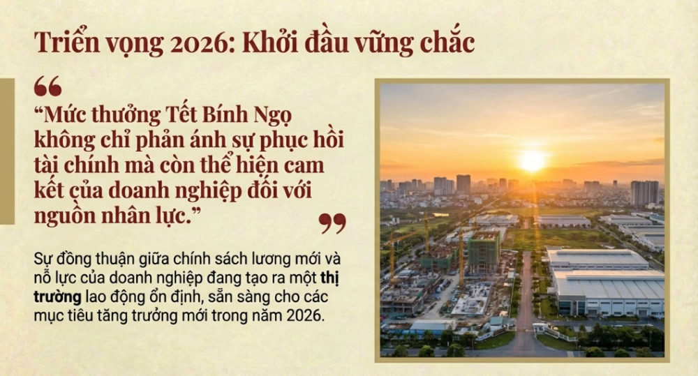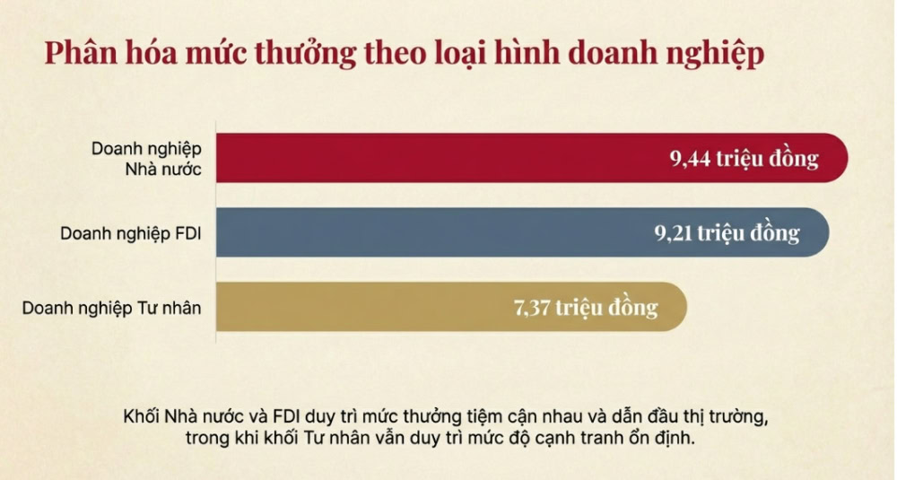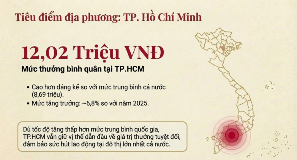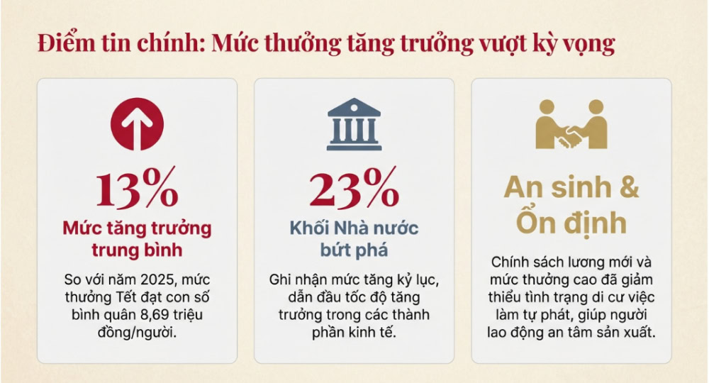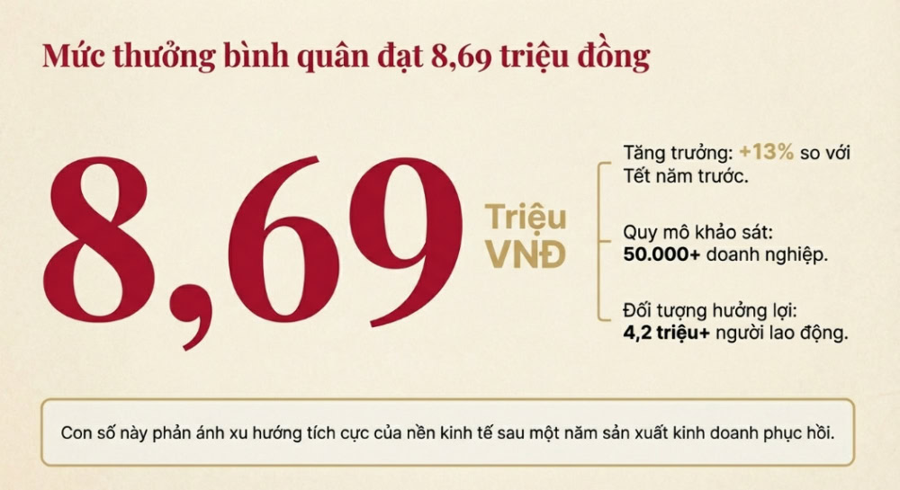 Theo thống kê từ hơn 50.000 doanh nghiệp với kế hoạch thưởng cho hơn 4,2 triệu lao động, mức thưởng Tết Nguyên đán Bính Ngọ 2026 bình quân đạt khoảng 8,69 triệu đồng/người, tăng 13% so với cùng kỳ năm trước.