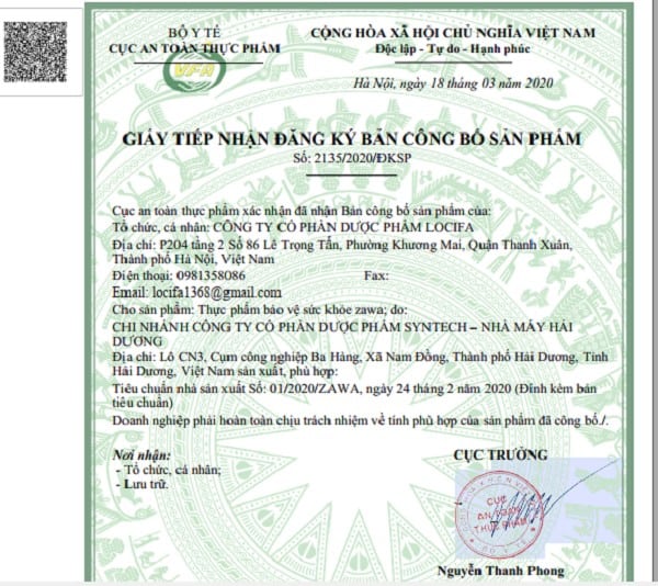 Được biết theo giấy tiếp nhận bản đăng ký công công bố sản phẩm 2135/2020/DKSP của Cục An toàn thưc phẩm thì Thực phẩm bảo vệ sức khỏe ZAWA do Chi nhánh Công ty Cổ phần Dược phẩm Syntech – nhà máy Hải Dương (địa chỉ Lô CN3, Cụm CN Ba Hàng, tp Hải Dương) sản xuất; được công bố bởi Công ty Cổ phần dược phẩm Locifa địa chỉ P204 tầng 2 Số 86 Lê Trọng Tấn, P. Khương Mai, Q. Thanh Xuân, TP. Hà Nội, Việt Nam.