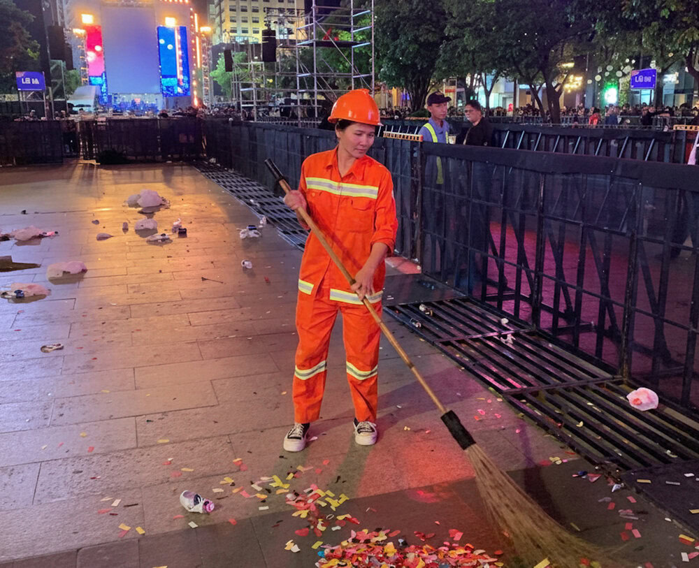 “Giao thừa xong là xe đông lắm, mà mình phải tranh thủ làm cho kịp trước sáng mùng Một. Nguy hiểm chứ, nhưng nghề mình chọn thì phải làm trọn.” chị Vân tâm sự. Nhiều lần, chị bật khóc khi thấy người ta ăn uống xong rồi quăng rác xuống chân mình. Không phải vì rác bẩn mà vì sự vô tâm. “Một vài người thiếu ý thức thôi cũng đủ làm tụi chị cực gấp nhiều lần. Chỉ cần người ta chịu khó đi thêm vài bước đặt rác đúng chỗ, mọi thứ sẽ khác.” chị nói.