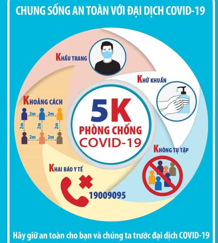 Để sống chung an toàn với đại dịch COVID-19, người dân cần tuân thủ thực hiện nguyên tắc 5K của Bộ Y tế: – Khẩu trang – Khử khuẩn – Khoảng cách – Không tụ tập – Khai báo y tế.