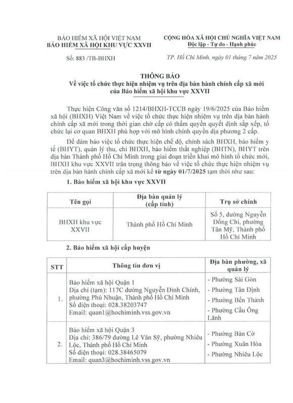 Theo Công văn số 1214/BHXH-TCCB ngày 19/6/2025 của BHXH Việt Nam, việc điều chỉnh này nhằm tổ chức lại hệ thống cơ quan BHXH trên địa bàn hành chính cấp xã mới, trong thời gian chờ quyết định chính thức của cấp có thẩm quyền. Trụ sở chính của BHXH Khu vực XXVII được đặt tại số 5, đường Nguyễn Đổng Chi, phường Tân Mỹ, TP. Hồ Chí Minh.
