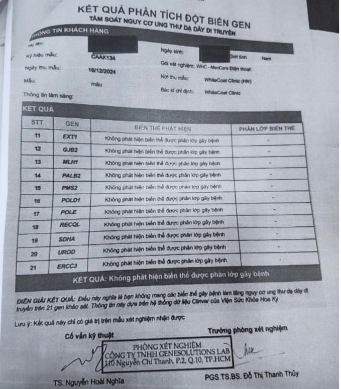 Ngày 17/4, thông tin từ Sở Y tế TP. HCM cho biết, đơn vị này vừa tiến hành kiểm tra đột xuất Phòng khám tư vấn sức khỏe thuộc Công ty TNHH Whitecoat Việt Nam (viếtv tắt là: Whitecoat Việt Nam) sau khi có phản ánh từ Báo Thanh Niên về dấu hiệu làm giả giấy xét nghiệm đột biến gen tầm soát nguy cơ ung thư.