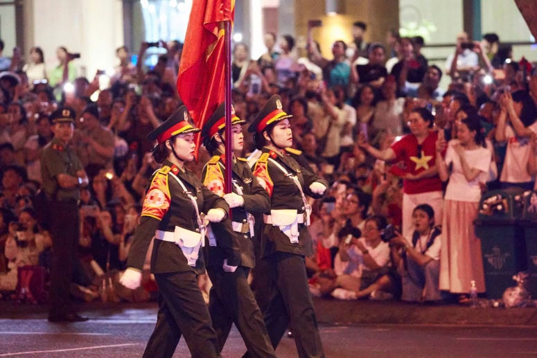 Khung cảnh rực rỡ ánh đèn và tiếng reo hò hòa cùng những đội hình nghiêm trang. Nhiều người dân cho biết, họ xúc động và tự hào khi nhiều ca khúc hùng tráng được vang lên, những đoàn diễu binh bắt đầu tiến vào. Ảnh Công Quyền.
