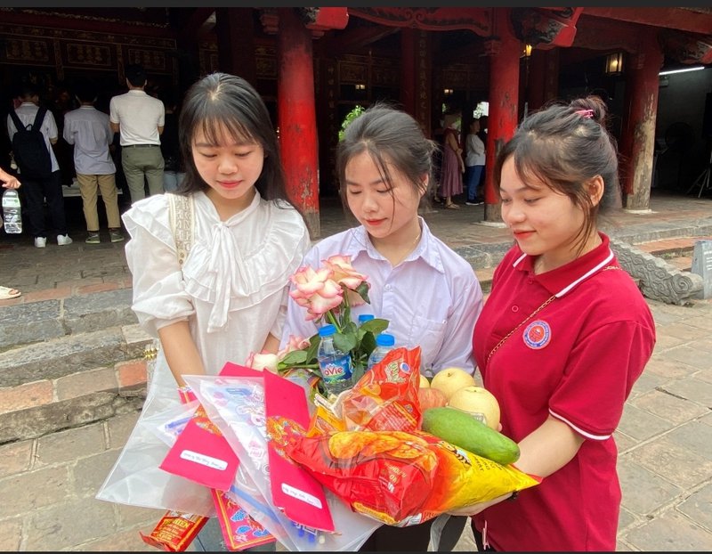 Các sĩ tử chuẩn bị lễ vào dâng sớ để cầu cho kì thi thành công, đạt được điểm cao. Em Minh Châu ( Quận Cầu Giấy, Tp Hà Nội ) chia sẻ “ Chúng em đến đây cầu xin may mắn, hoàn thành bài tốt cho kỳ thi tới, dù biết đây là kì thi rất khốc liệt nhưng tâm lý em khá thoải mái, tự tin”