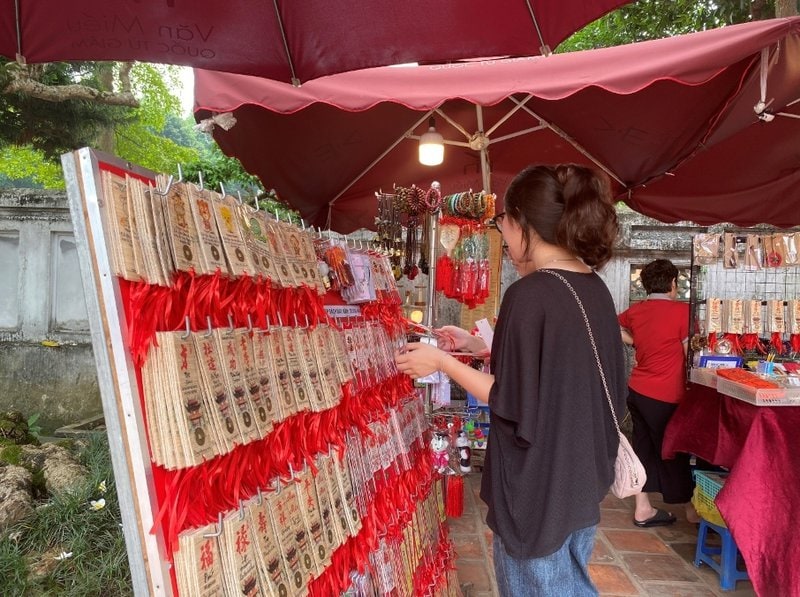 Sau khi làm lễ, nhiều sĩ tử mua dây đeo chữ với hi vọng may mắn đạt được kết quả tốt trong kì thi