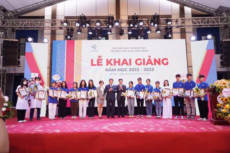 Tại lễ khai giảng, lãnh đạo Trường Đại học Hòa Bình đã trao thưởng cho 15 tân sinh viên đạt Danh hiệu Thủ khoa năm học 2022 – 2023 và 8 sinh viên có thành tích xuất sắc trong năm học 2021 – 2022.