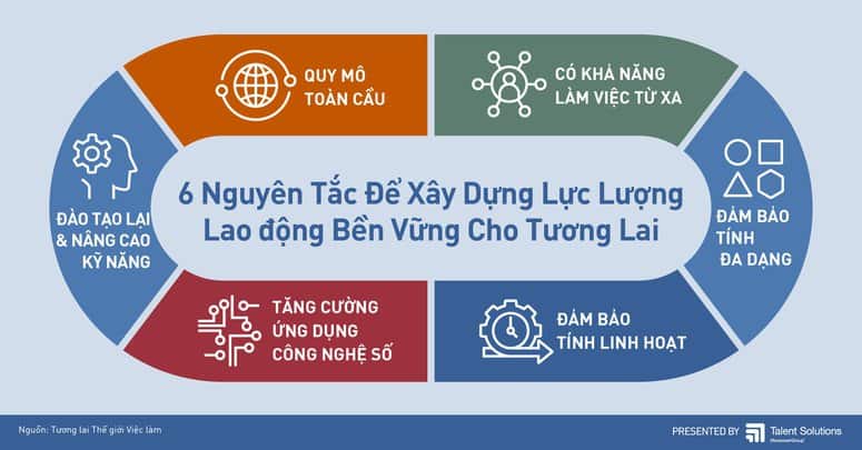 Nhấn mạnh tầm quan trọng của việc “Xây dựng lực lượng lao động bền vững cho tương lai”, báo cáo đã đưa ra 6 nguyên tắc “trụ cột” để hiện thực hóa mục tiêu này. Cụ thể là: Đào tạo lại & nâng cao kỹ năng; Hướng tới quy mô toàn cầu; Có khả năng làm việc từ xa; Tăng cường ứng dụng công nghệ số; Đảm bảo tính linh hoạt và Đảm bảo tính đa dạng của lực lượng lao động.