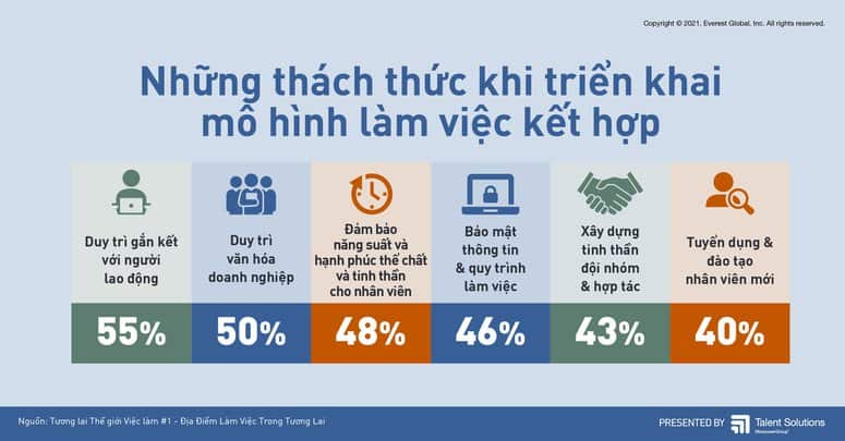Cũng tại báo cáo này, Manpower Group cho rằng trong khi hầu hết các tổ chức đều nhận thấy lợi ích của mô hình làm việc kết hợp thì việc lên kế hoạch và triển khai trong thực tế vẫn còn gặp nhiều khó khăn. Trong đó các khó khăn chính có thể kể tới như: Duy trì gắn kết với người lao động; Duy trì văn hóa doanh nghiệp; Bảo mật thông tin & quy trình làm việc…