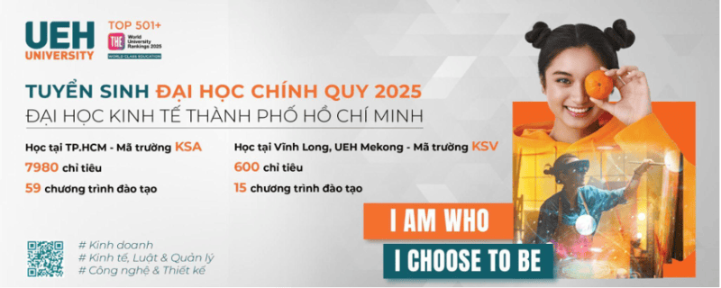 Năm 2025, UEH tuyển sinh 7980 chỉ tiêu (tăng 80 chỉ tiêu so với 2024), tương ứng 59 lựa chọn chương trình học tại TP.HCM (mã trường: KSA) và 600 chỉ tiêu, 15 chương trình học tại Vĩnh Long (UEH Mekong, mã trường: KSV).