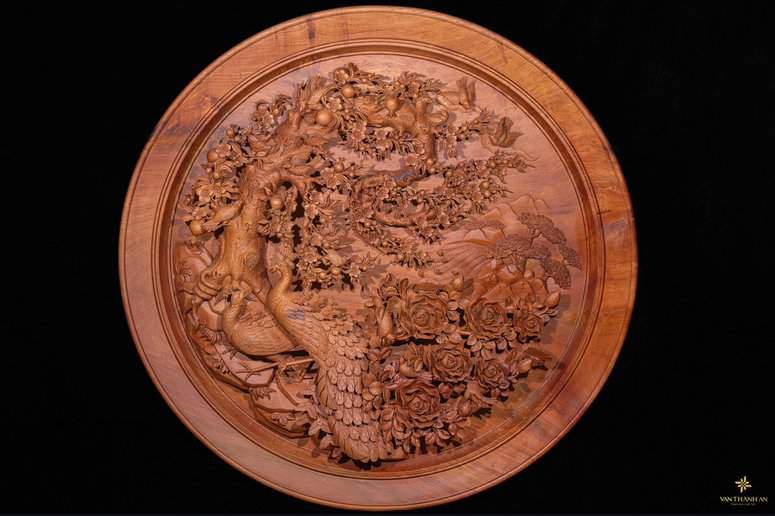Như để minh chứng cho điều đó, anh Thành giới thiệu một số tác phẩm mỹ nghệ phong thuỷ đang được trưng bày trang trọng tại Showroom Vạn Thành An. Đó là tác phẩm Bách Điểu Phù Dung chế tác từ thế gỗ Hoàng Đàn cao 30cm, dài 120cm, rộng 15cm với khối lượng gần 20 kg, được nghệ nhân dành hơn 2 năm để hoàn thiện. Đây là câu chuyện về một buổi sáng bình yên với hình ảnh 100 loài chim tới dự hội, gợi lên hình ảnh một đại hội quần tiên. Bách Điểu Phù Dung phù hợp trưng bày trong phòng khách nhằm thể hiện sự rộng lượng, uy nghiêm và có tài.