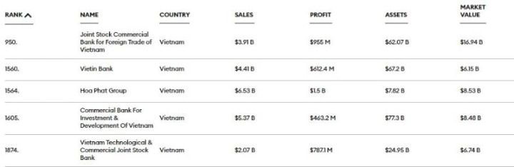 Ngoài Vietcombank, trong danh sách Global 2000 năm nay còn có 4 đơn vị khác của Việt Nam lần lượt có vị trí là 1.560, 1.564, 1.605 và 1.854.