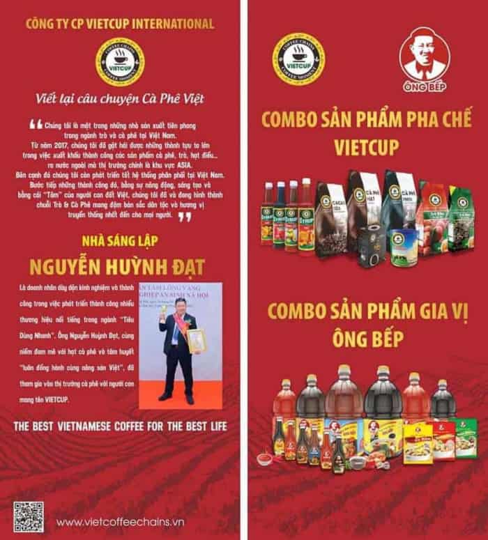Vietcup là đơn vị phát triển chuỗi cà phê nhượng quyền theo tiêu chuẩn khép kín. Theo đó, Vietcup là đơn vị trực tiếp sản xuất và cung cấp cho thị trường 250 sản phẩm thuộc ngành hàng thực phẩm và gia vị, ăn uống và chăm sóc sức khỏe toàn diện cho người tiêu dùng.