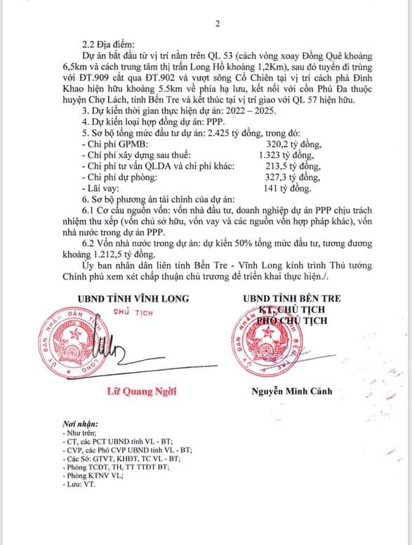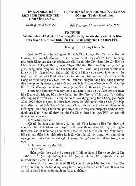 Tờ trình UBND 2 tỉnh Vĩnh Long và Bến Tre trình Thủ tướng Chính phủ phê duyệt