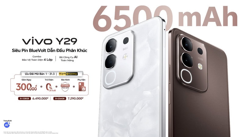 Theo hãng công bố, giá niêm yết cho điện thoại vivo Y29 (8+128GB) là 6.490.000 đồng và với phiên bản Y29 (8+256GB) là 7.290.000 đồng được bán đặc quyền tại chuỗi cửa hàng Thế giới Di Động. Đặc biệt với chương trình hot sale tháng mở bán diễn ra từ ngày 1/3 – 31/3/2025, khách hàng sẽ được giảm ngay 300.000 đồng, trả góp 0%, bảo hành vivo care 24 tháng và phụ kiện khi mua sản phẩm.