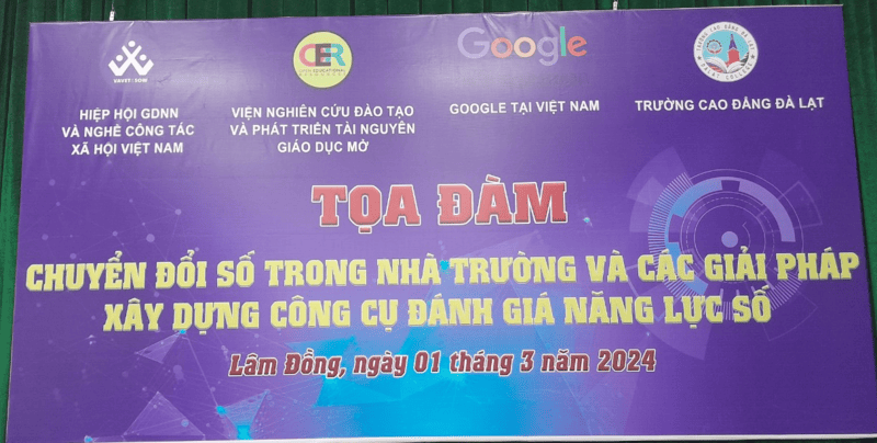 Sáng ngày 01/03/2024, Văn phòng đại diện Hiệp hội Giáo dục Nghề nghiệp và nghề Công tác Xã hội Việt Nam tại thành phố Hồ Chí Minh phối hợp với Trường Cao đẳng Đà Lạt; Viện Nghiên cứu, Đào tạo và Phát triển Tài nguyên Giáo dục Mở; Đại diện Google tại Việt Nam tổ chức tọa đàm “Chuyển đổi số trong nhà trường và các giải pháp xây dựng công cụ đánh giá năng lực số” với mục đích: Gợi ý một số vấn đề cơ bản về xây dựng trường học số, cách xây dựng khung năng lực số phù hợp với một số nhóm đối tượng trong xã hội, công cụ đánh giá các năng lực số, cũng như các khía cạnh đặc thù của Giáo dục và Đào tạo Nghề trong các khung đó.