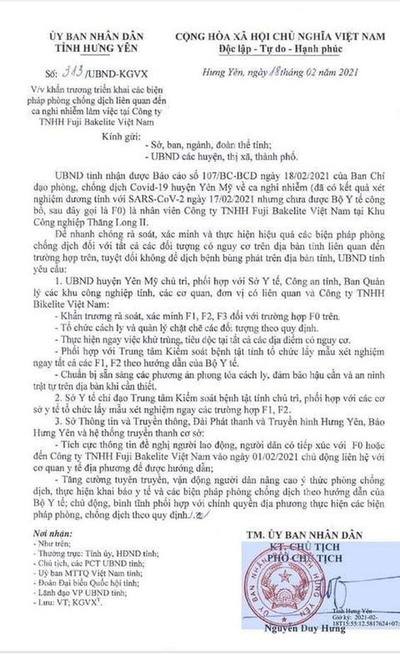 Cụ thể, UBND tỉnh Hưng Yên nhận được Báo cáo số 107/BC-BCĐ ngày 18/2/2021 của Ban Chỉ đạo phòng, chống dịch COVID-19 huyện Yên Mỹ về ca nghi nhiễm là nhân viên Công ty TNHH Fuji Bakelite Việt Nam tại Khu Công nghiệp Thăng Long II (đã có kết quả xét nghiệm dương tính với SARS-CoV-2 ngày 17.2.2021 nhưng chưa được Bộ Y tế công bố, sau đây gọi là F0).