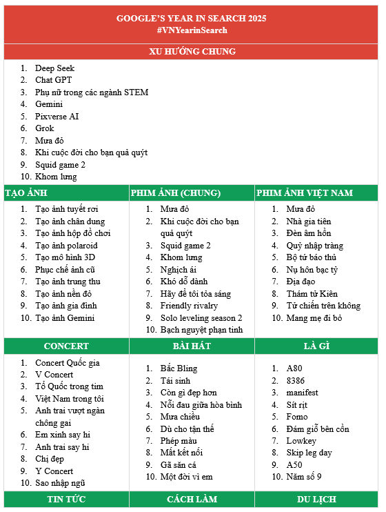 Đến hẹn lại lên, khi năm 2025 chuẩn bị khép lại, Google công bố danh sách Year in Search 2025, bao gồm 10 chủ đề: “Xu hướng chung”, “Tạo ảnh”, “Phim ảnh (chung)”, “Phim ảnh Việt Nam”, “Concert”, “Bài hát”, “Tin tức”, “Cách làm”, “Là gì” và “Du lịch”. Danh sách phản ánh những xu hướng và thông tin được người Việt quan tâm và tìm kiếm nhiều nhất trong năm 2025.