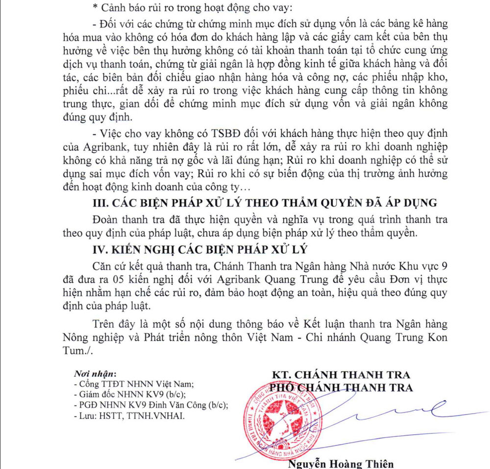 Chánh Thanh tra Ngân hàng Nhà nước Khu vực 9 đã ban hành Kết luận thanh tra số 238/KL-TTNH ngày 1/12/2025, đối với Ngân hàng Nông nghiệp và Phát triển Nông thôn Việt Nam Chi nhánh Quang Trung Kon Tum (viết tắt Agribank Quang Trung Kon Tum). Tại Agribank Quang Trung Kon Tum, cơ quan thanh tra xác định chi nhánh còn để xảy ra tình trạng hồ sơ tín dụng chưa đầy đủ, chưa bảo đảm đúng thành phần theo quy định. Một số báo cáo thẩm định khoản vay được lập nhưng chưa phân tích, đánh giá đầy đủ năng lực tài chính của khách hàng, hiệu quả và tính khả thi của phương án sản xuất – kinh doanh, dẫn đến chất lượng thẩm định chưa đáp ứng yêu cầu.